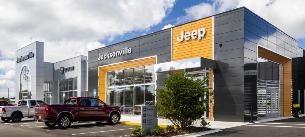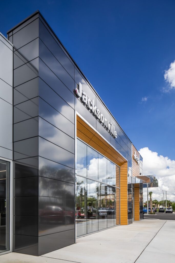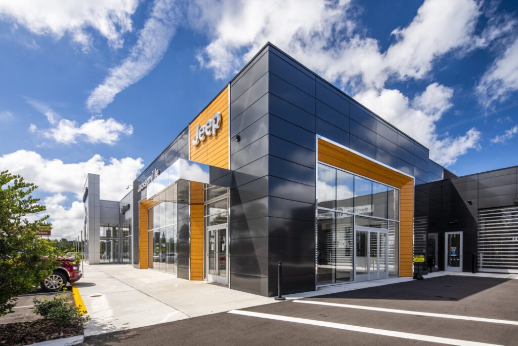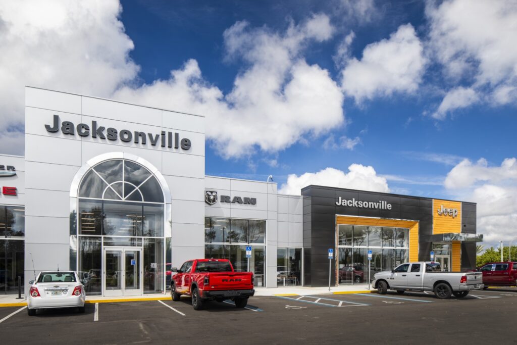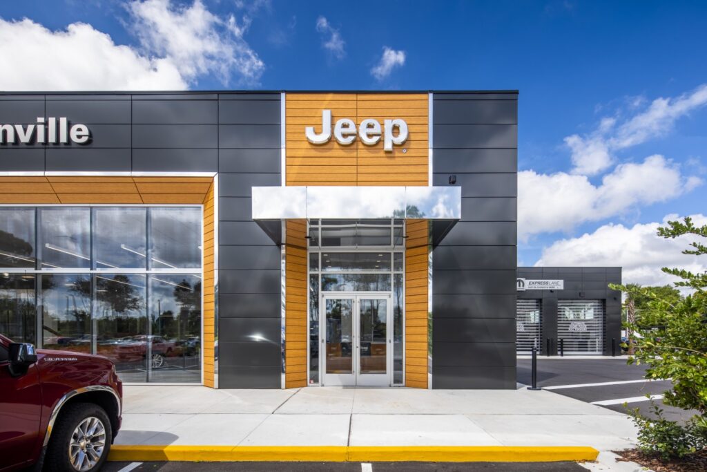 CDR+Jeep Pickettville is a new automotive dealership in Jacksonville, FL, which includes a vehicle showroom and full-service shop and detailing area. The showroom area consists of Sales and Finance offices, customer lounge and Café and a New Vehicle Delivery space. The Showroom is accompanied by an attached adjacent Service Drive and Service Writers area. One of the challenges of this project was to amalgamate the design standards for the two brands, CDR (Chrysler, Dodge and RAM) and Jeep, and make the space flow while identifying with their individual brand identities. The new very distinct Jeep exterior brand colors and design elements created a strong visual design character. The choice of glazing and lighting was very critical for the visibility of vehicles within the showroom area from the exterior.