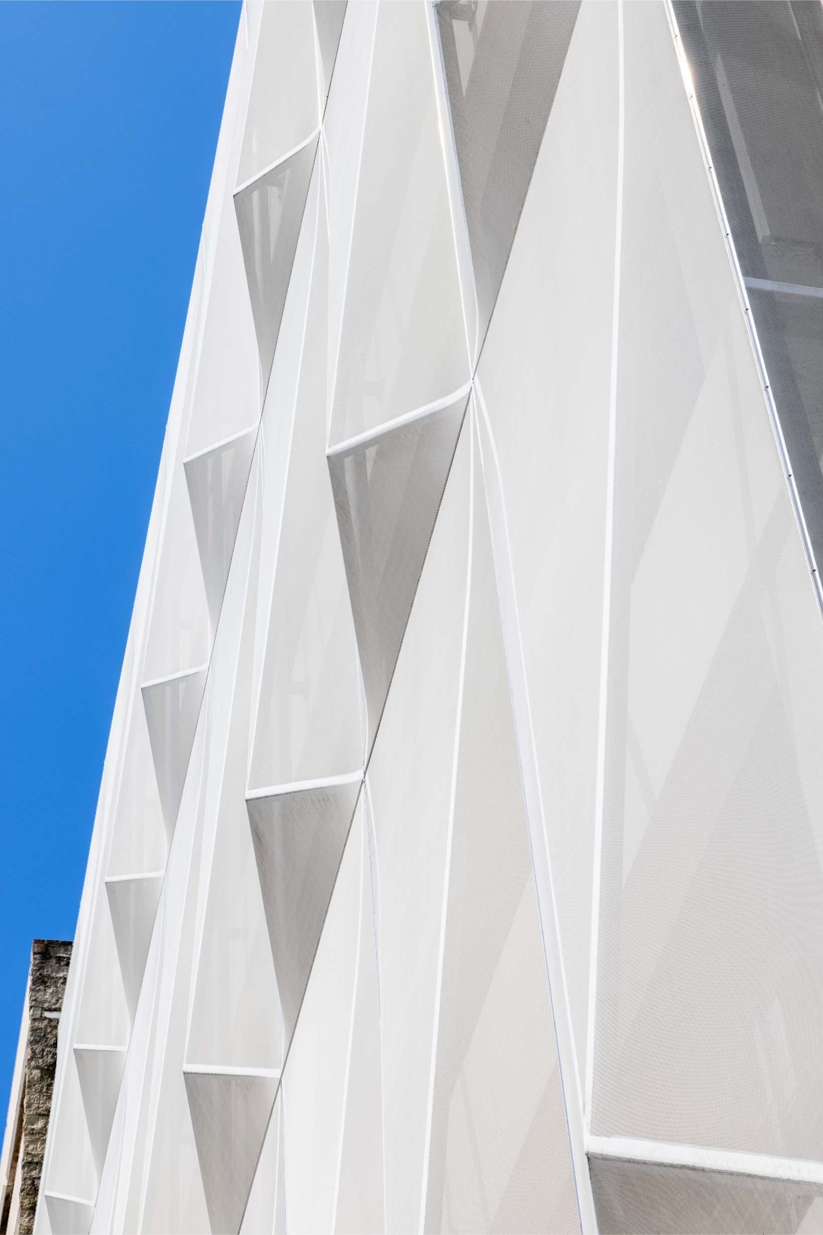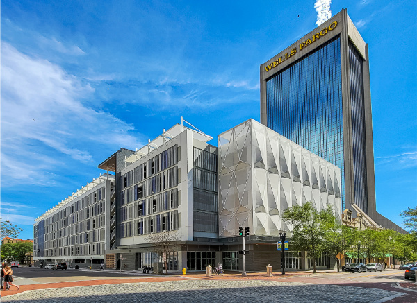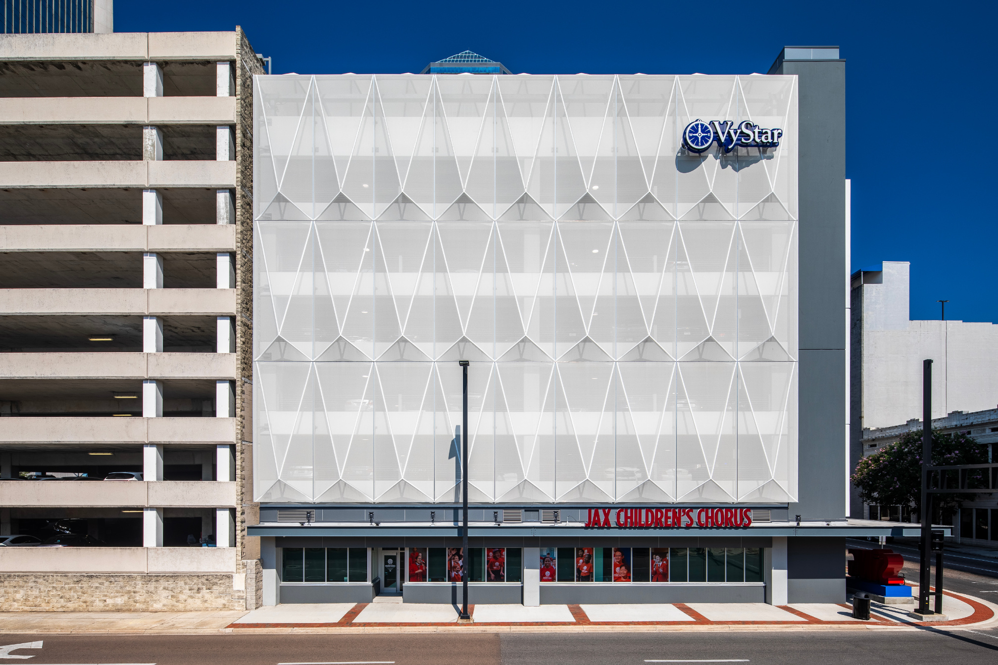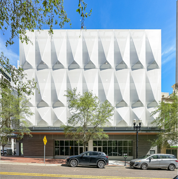 The goals of the project were to construct an efficient structure that also respects the main pedestrian artery of Laura Street on the west and Main Street along the east. Retail storefronts are designed at these primary intersections with a neutral sculptural lightweight fabric façade above, shielding view of the parking. The long north elevation along Forsyth Street is clad in a random pattern of perforated, corrugated aluminum panels. The primary stair tower & elevator are pulled back from the corner to maximize contiguous retail space and to allow the maximum amount of storefront at the Laura/Forsyth corner.
