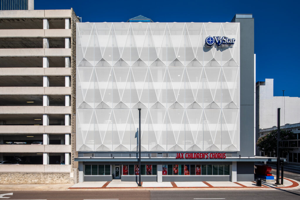 The Forsyth Garage is a 7 level parking structure with ground level retail facing Laura, Forsyth & Main Streets. Vystar Credit Union, having recently moved their corporate headquarters into downtown Jacksonville, made a commitment to renovate a series of buildings along Laura Street, the primary pedestrian thoroughfare in Jacksonville. Needing parking for their staff, Vystar selected a Design/Build team of Danis Construction and Dasher Hurst Architects to design the new garage, which will also provide parking for adjacent upcoming developments and a modest amount of public parking.