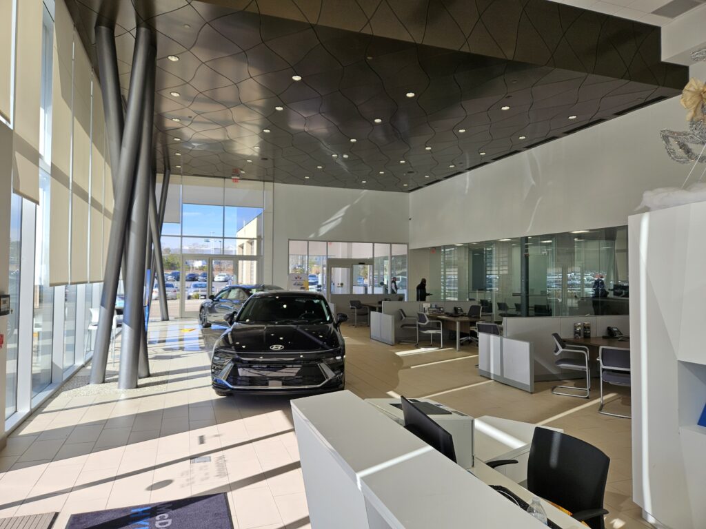 The two-story, 51,400 SF structure is composed of an automotive showroom, service shop and carwash, and a cantilevered vehicle display deck for Hyundai that overlooks the I-75 corridor. The front façade of the showroom has a 5-foot overhanging structure on the exterior and it is clad with ACM ‘shaped sky’ panels, creating an elegant organic shaped design which rests over a 20-foot-tall curtain wall system with clear glazing. The exterior ‘shaped sky’ ACM panels wrap the exterior soffit and continue into the interior of the showroom in the same plane, thus integrating the interior with the exterior. The roof structure is held up by four clusters of three interlaced and angled “bamboo” columns which rest on a pebbled floor in order to mimic the natural elements of a forest. The showroom elements continue into the customer lounge and cafe, which are located next to a 10-foot-tall and 20-foot-wide all-glass system, giving a clear view of the service shop, and showcasing the complimentary finishes between these adjacent spaces. The customer lounge displays a gas-fired fireplace clad with natural stone, creating a warm and inviting environment. Overall, the sharp and contemporary aesthetics of the building are an example of the service they provide to their customers.