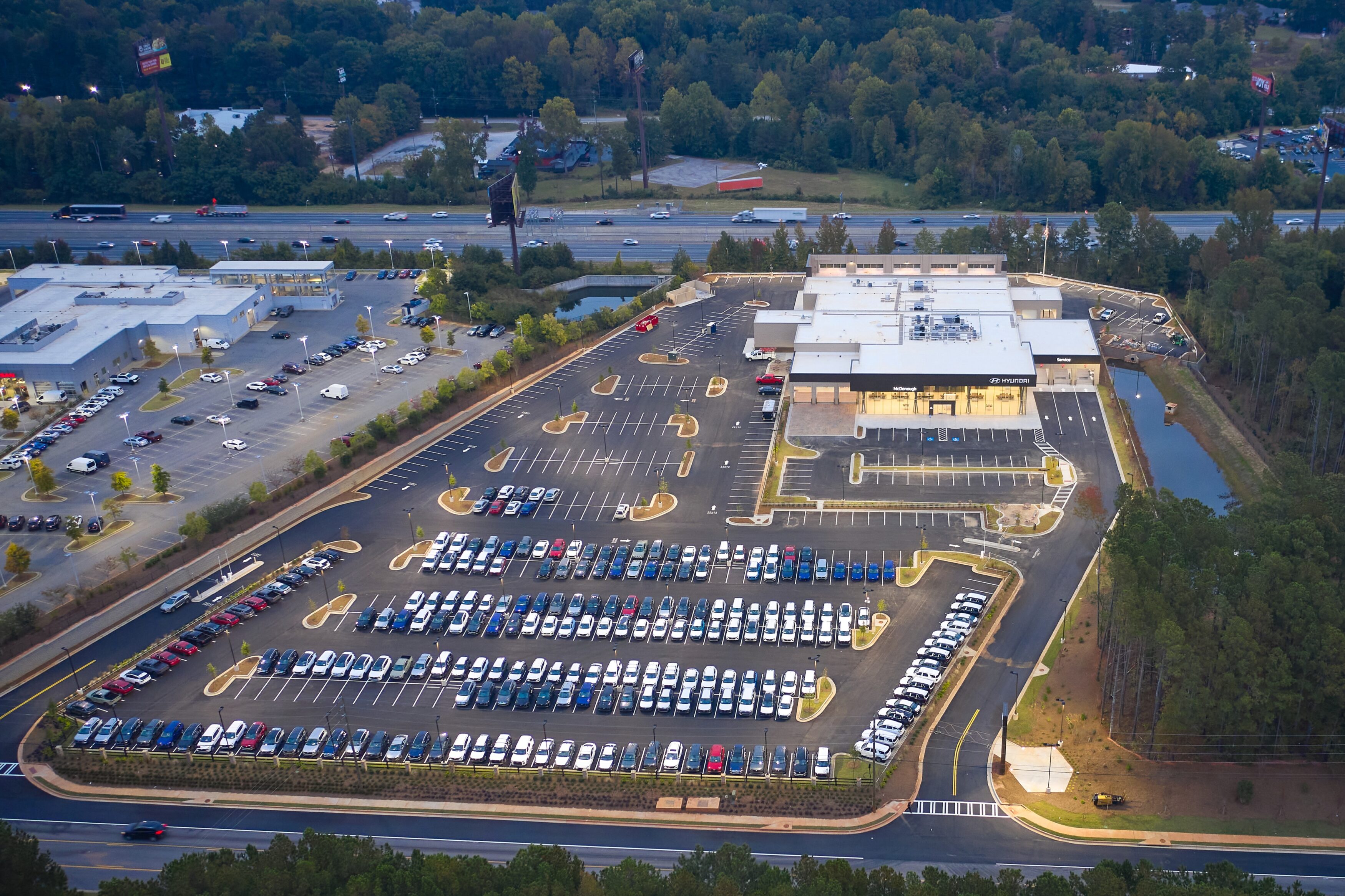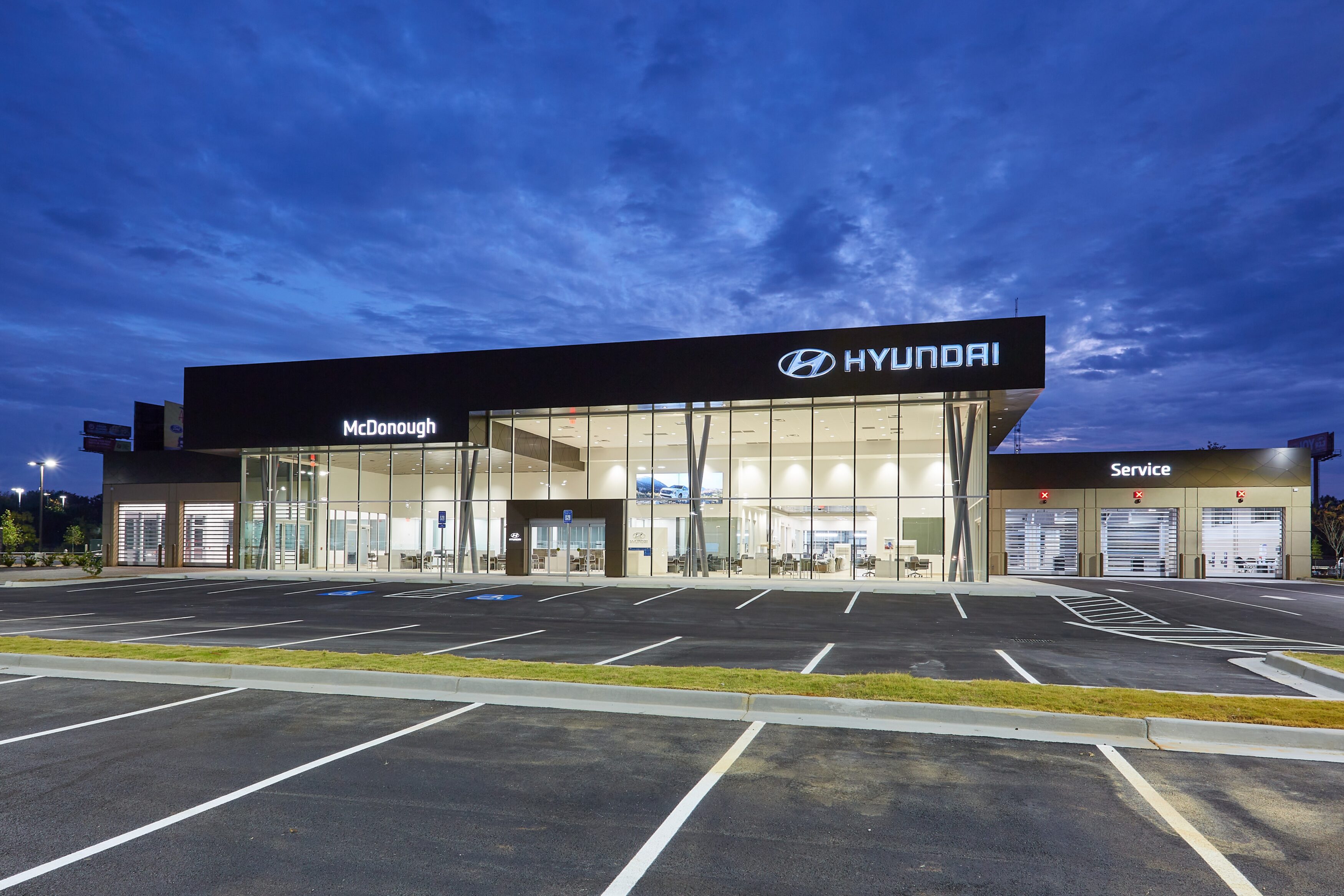 The two-story, 51,400 SF structure is composed of an automotive showroom, service shop and carwash, and a cantilevered vehicle display deck for Hyundai that overlooks the I-75 corridor. The front façade of the showroom has a 5-foot overhanging structure on the exterior and it is clad with ACM ‘shaped sky’ panels, creating an elegant organic shaped design which rests over a 20-foot-tall curtain wall system with clear glazing. The exterior ‘shaped sky’ ACM panels wrap the exterior soffit and continue into the interior of the showroom in the same plane, thus integrating the interior with the exterior. The roof structure is held up by four clusters of three interlaced and angled “bamboo” columns which rest on a pebbled floor in order to mimic the natural elements of a forest. The showroom elements continue into the customer lounge and cafe, which are located next to a 10-foot-tall and 20-foot-wide all-glass system, giving a clear view of the service shop, and showcasing the complimentary finishes between these adjacent spaces. The customer lounge displays a gas-fired fireplace clad with natural stone, creating a warm and inviting environment. Overall, the sharp and contemporary aesthetics of the building are an example of the service they provide to their customers.
