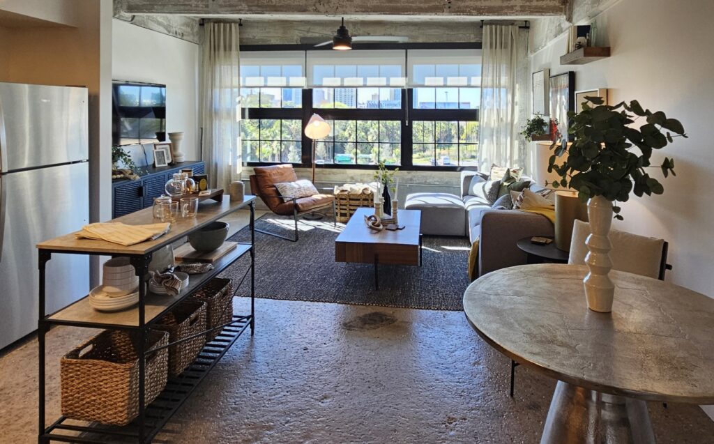 The complex program transformed the top three levels into market rate apartments, a ground level that is split between residential and community commercial space, and a basement with both commercial space as well as a 80 space indoor parking area. The rooftop is amenitized with a rooftop terrace with sweeping views of downtown and the nearby professional athletic venues.